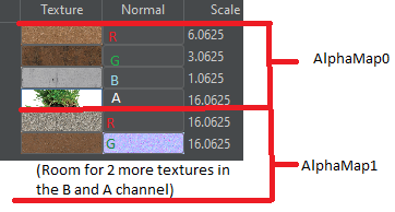 Essentially the texture is being used as a data storage object so the shader can be optimized better. So when you paint a terrain in the SDK’s terrain editor, it is actually painting either the red, green, blue, or alpha channel of the alphaMap. And then the terrain shader reads those values to do texture splatting using all of the other real textures (like dirt,grass,etc) that you painted onto the terrain.
